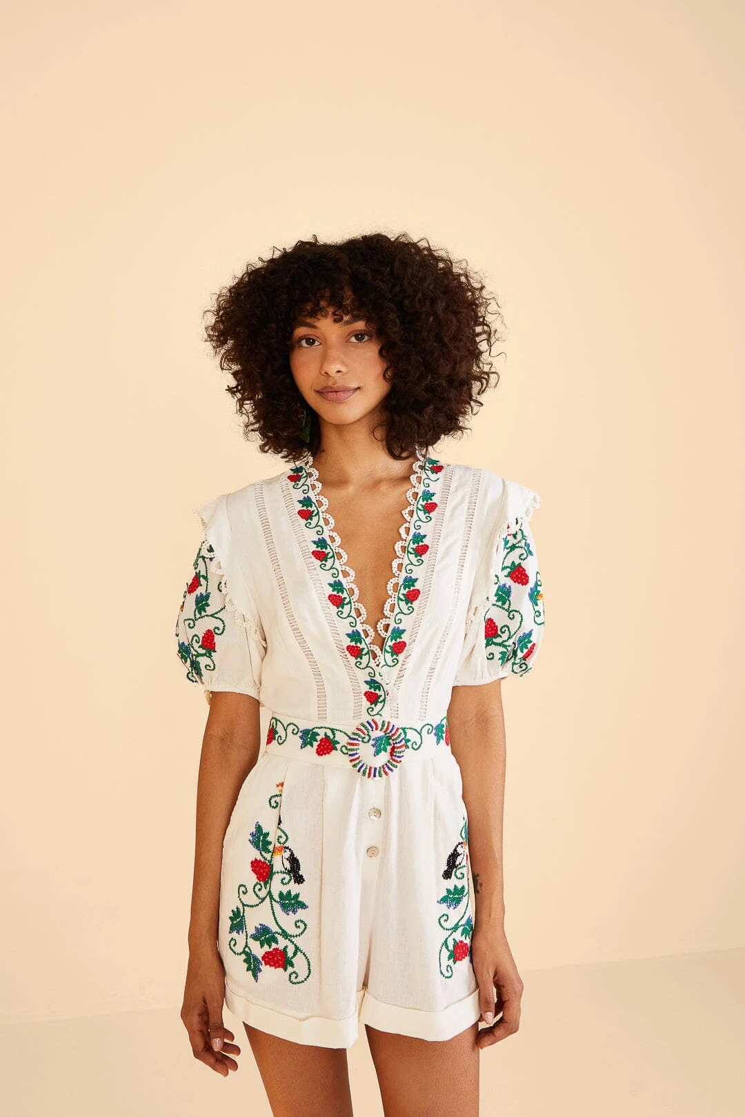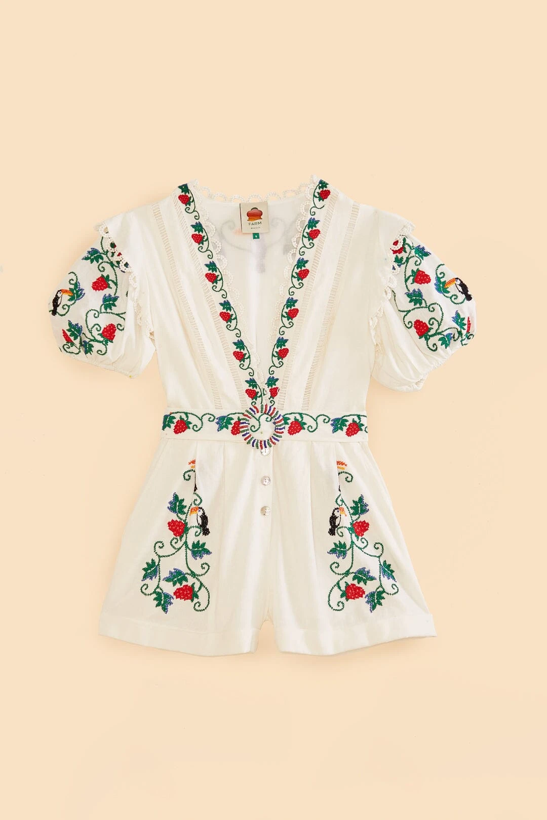 Your go-to piece for creating meaningful moments of pure joy. The Cross Stitch Toucan Embroidered Romper is here to make you feel chic yet cool with its plunging neckline, cute lace, a far-from-ordinary embroidered work, and a mini length to reintroduce your legs to warm days, all in the easiest silhouette to step into Summer. Your new wardrobe staple matches solar shoes, from sandals to flip-flops, and colorful artisanal accessories.