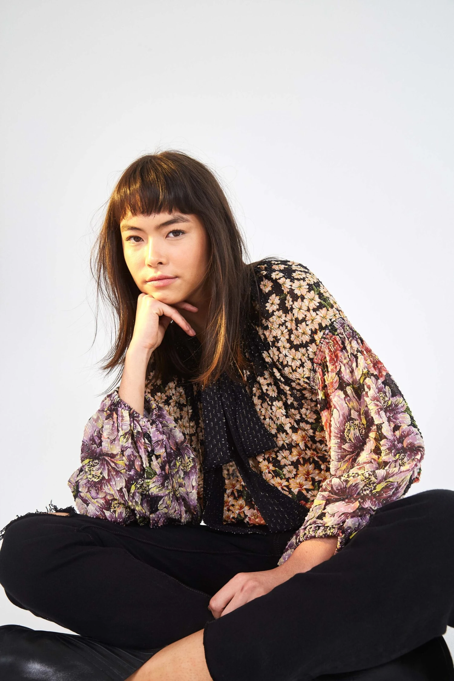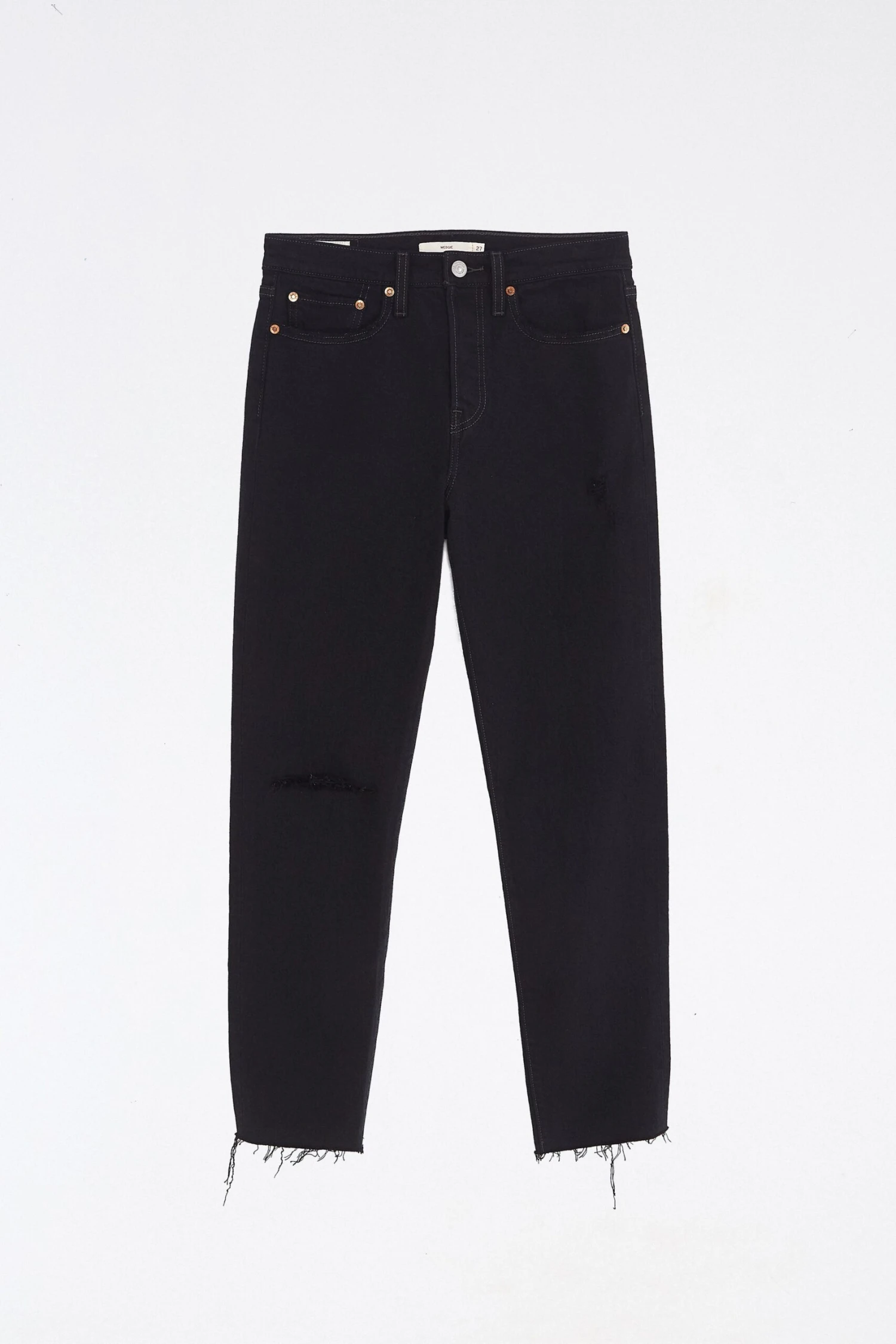 Straight leg jeans in jet black wash. Distressed detailing. Raw hem. Zip fly with button closure. Five pocket design.