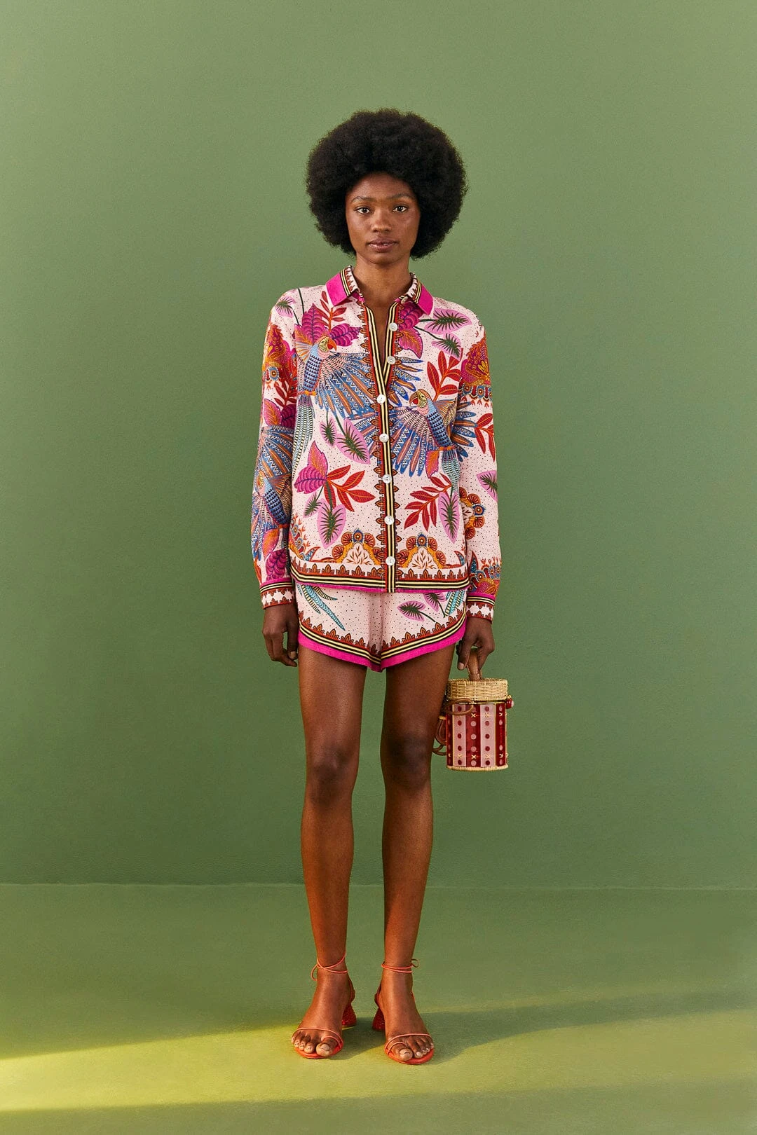 Flying higher is what happens when you choose the Pink Macaw Scarf Shirt to spread joy everywhere! It has an effortless fit with versatile buttons to be the best companion to all your bottoms, from shorts to pants to skirts (but the Pink Macaw Scarf Shorts are the best match!). This new print is a bold addition to your timeless wardrobe, and the long sleeves help you deal with the breeze and elevate any look <3 Go shine, baby!