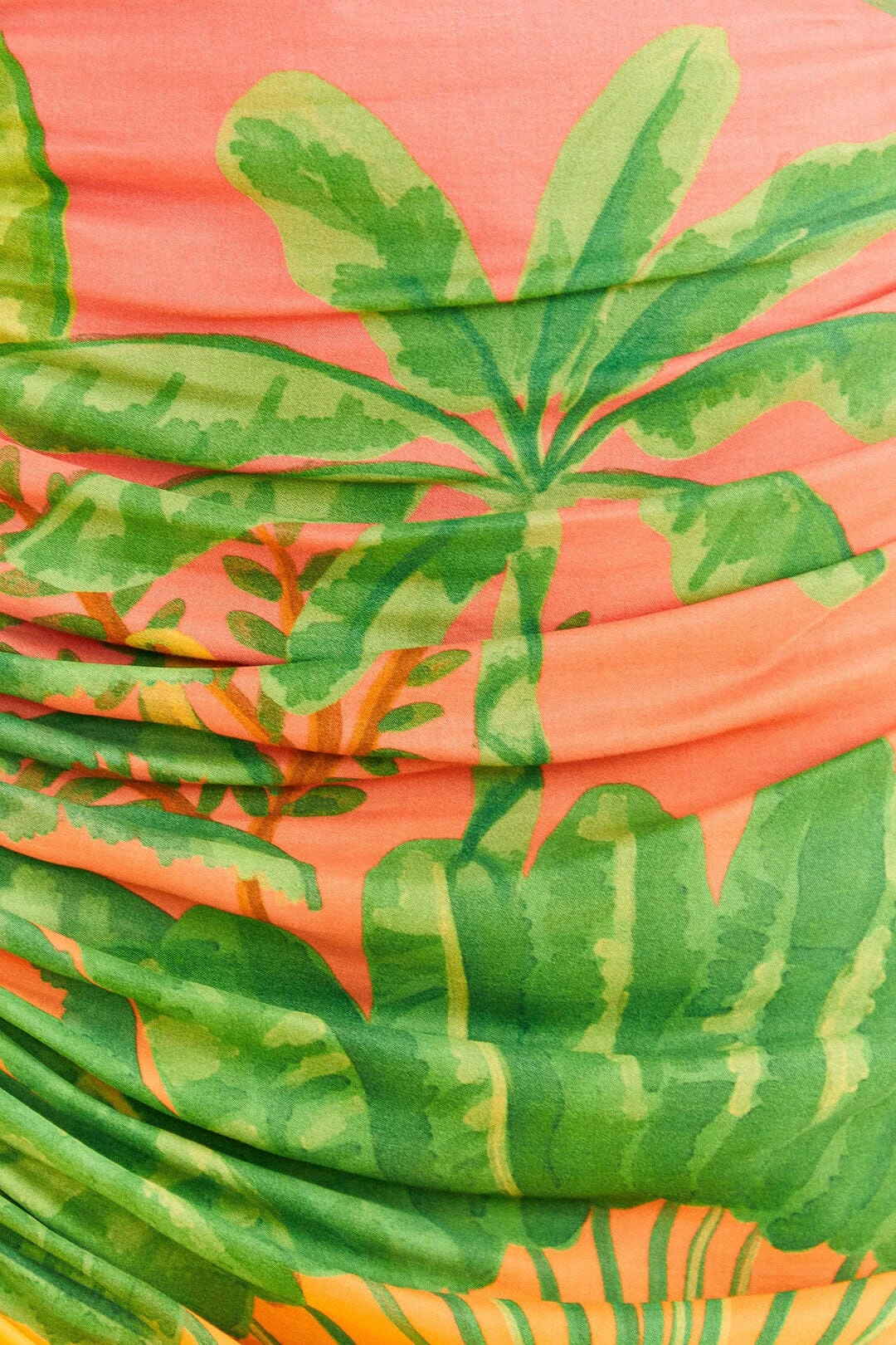 Cheers to more sunlight hours to be in the far-from-ordinary Sunrise Scenario Lenzing™ Ecovero™ Viscose Mini Skirt! It features an easy-breezy silhouette with ruched detailing and beaded tassels to follow your bold moves all season long. Your tops in the same print or color palette, bold shoes, and artisanal accessories are also invited to complete the tropical look, and you’ll be ready to express your bold self in every place 🙂